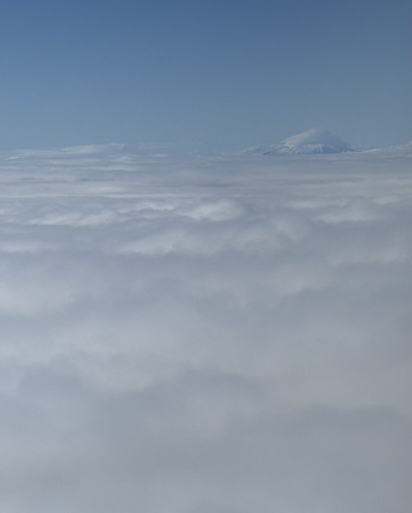 雲の海の間から富士山(多分)の頭がひょっこり。